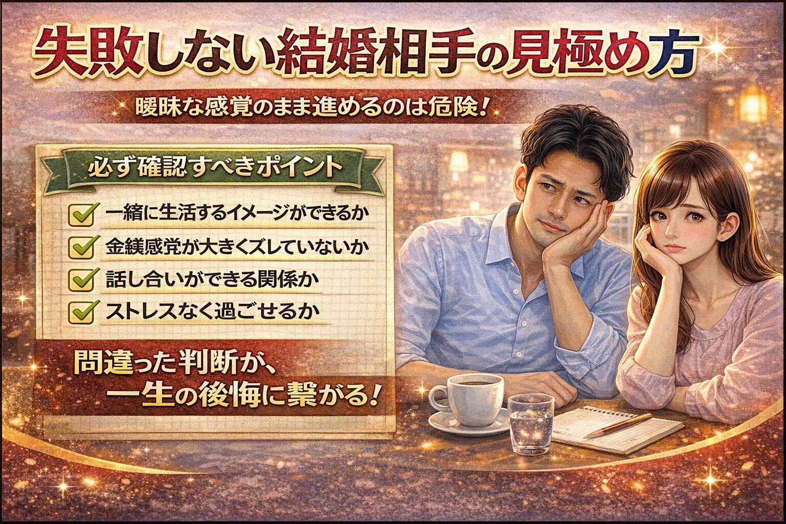 恋愛ではなく、結婚という視点で相手を見ることができれば、結果は大きく変わります。