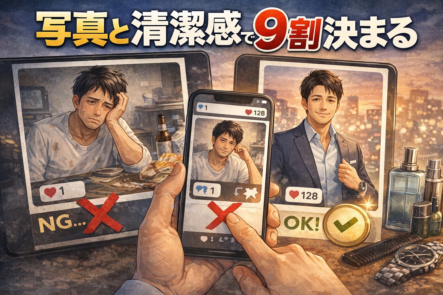 身もふたもない話に聞こえるかもしれませんが、婚活は第一印象が極めて重要です。とくに40代男性は、写真と清潔感が整うだけで「安心できそう」「ちゃんとしていそう」という評価に直結します。逆にここが弱いと、会う前に落ちます。