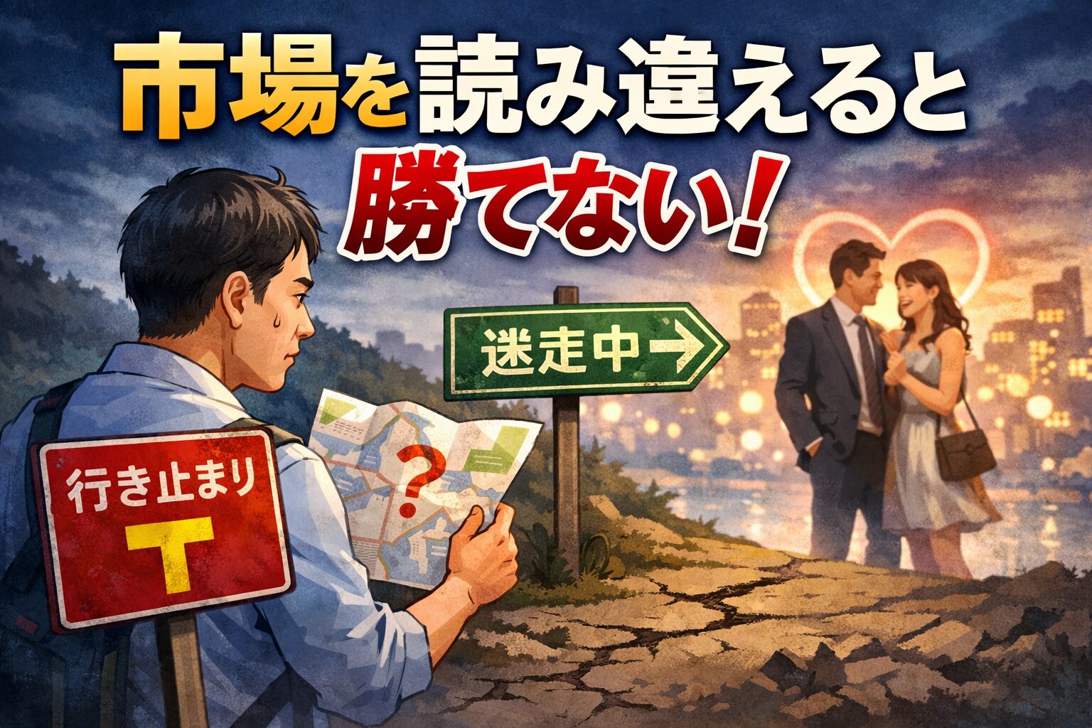 40代男性が最初に誤りやすいのは、「自分が戦うべき市場」を間違えることです。例えば、恋愛市場の延長として婚活を捉え、若い頃の感覚のまま動いてしまうケースです。これは非常に危険です。婚活では、好かれる要素が“恋愛のドキドキ”から“結婚の安心”へシフトしています。