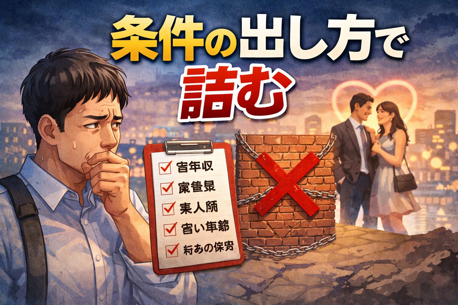 40代男性が苦戦する典型は、条件の出し方が“強すぎる”ことです。たとえば「年齢は〇歳まで」「見た目はこう」「家事はこう」「価値観はこう」と、理想が増えるほど出会いの母数が減ります。母数が減ると、相性以前に“会えない”という状態になります。