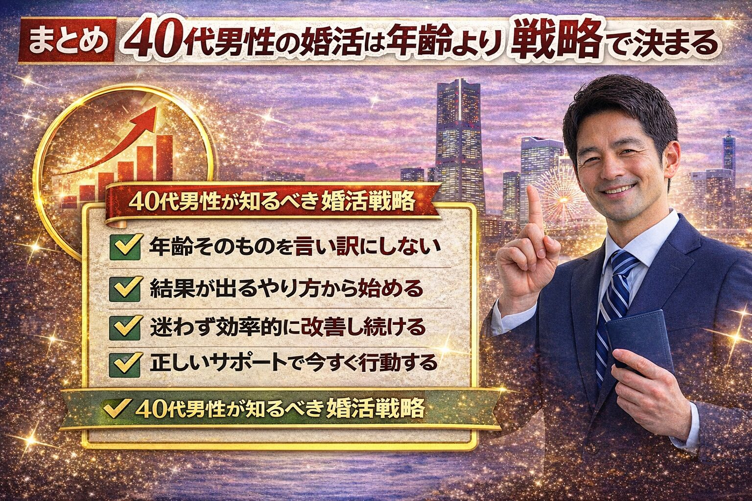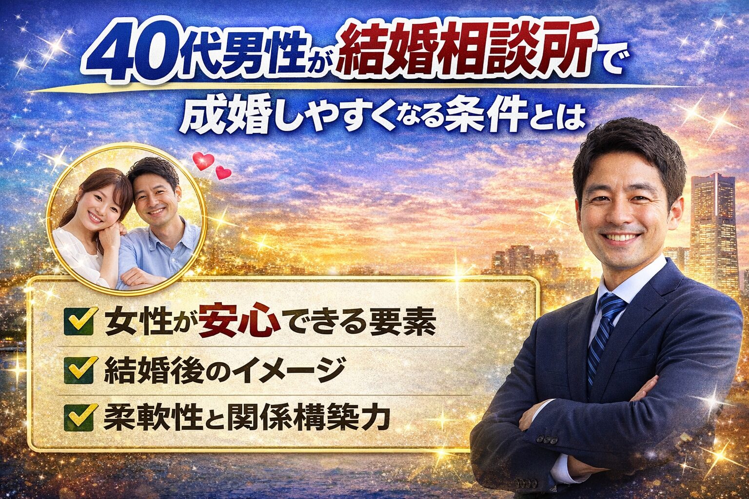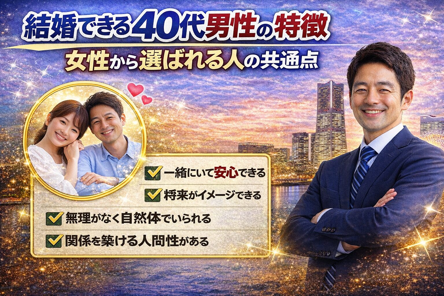 ここまでお読みいただいた方は、もうお分かりだと思います。40代男性の婚活は、決して「年齢だけ」で決まるものではありません。実際に横浜でも、40代で短期間成婚する男性は確実に存在していますし、逆に年齢が若くても結果が出ない男性もいます。