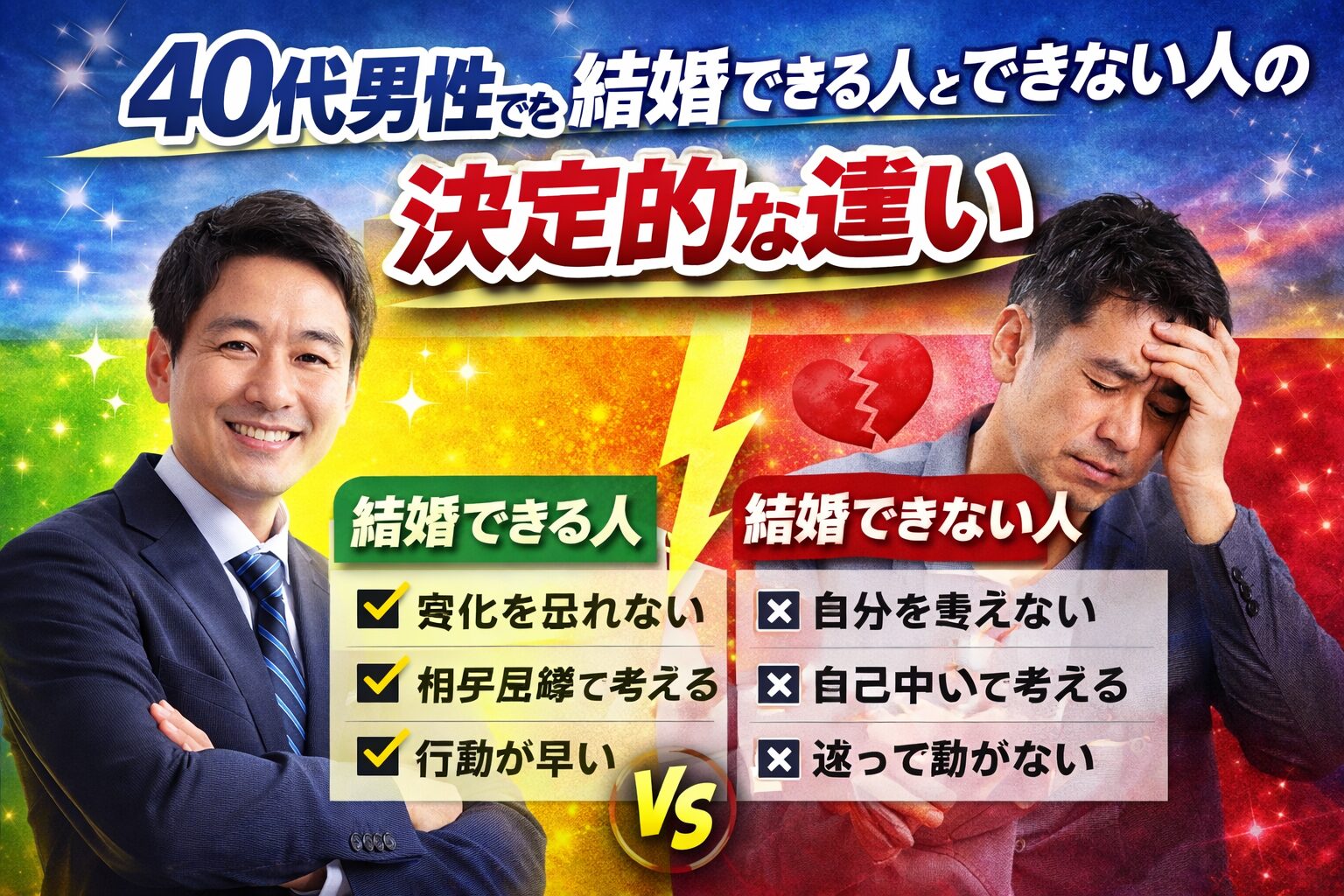 同じ40代男性でも、「半年で成婚する人」と「1年以上結果が出ない人」に分かれるのが婚活の現実です。そしてここで重要なのは、その差は年齢ではなく“考え方と行動”で決まるという点です。