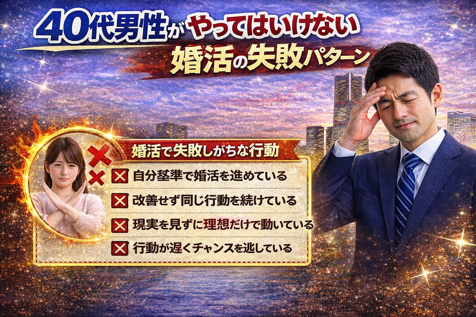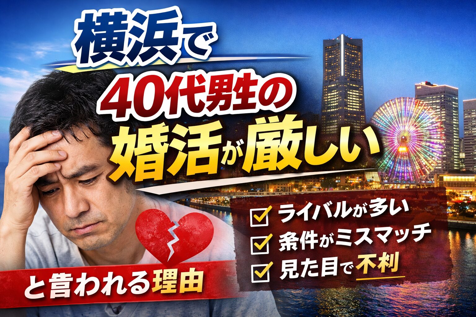 横浜で40代男性の婚活が厳しいと言われる理由は、年齢だけではありません。競争環境、見られ方、自己評価のズレ、行動設計の甘さ、この4つが重なることで苦戦しやすくなります。