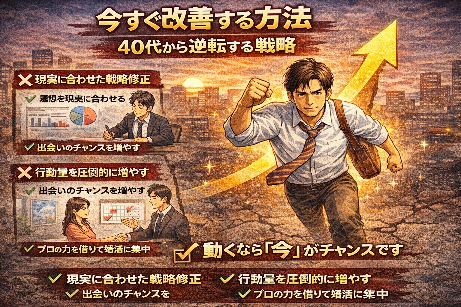 40代男性の婚活について、現実・原因・改善方法までお伝えしてきました。
